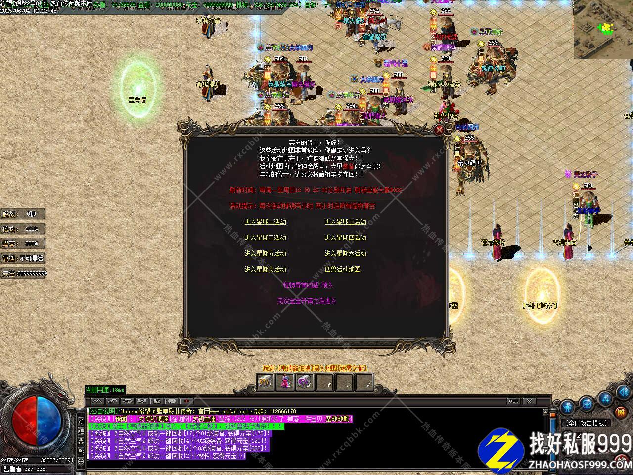 版本介绍:新增神魔活动,这些活动地图非常危险,活动地图为原始神魔战场,大量装备遗落至此,年轻的修士,请务必将始祖宝物夺回,刷新时间:每周一至周日12:30 22:30分别开启,刷新全服大量BOS,每次活动持续两小时,两小时后所有怪物清空。