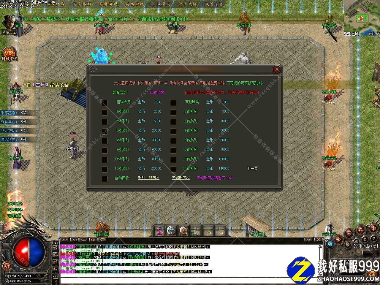 版本介绍:真假轮回每天举行2次,散人转生福利,打掉3只“真轮回精”可直接提升转生等级,九世轮回精有几率爆出本服超级技能“群雷术”以及“彻地钉”“定身术”。