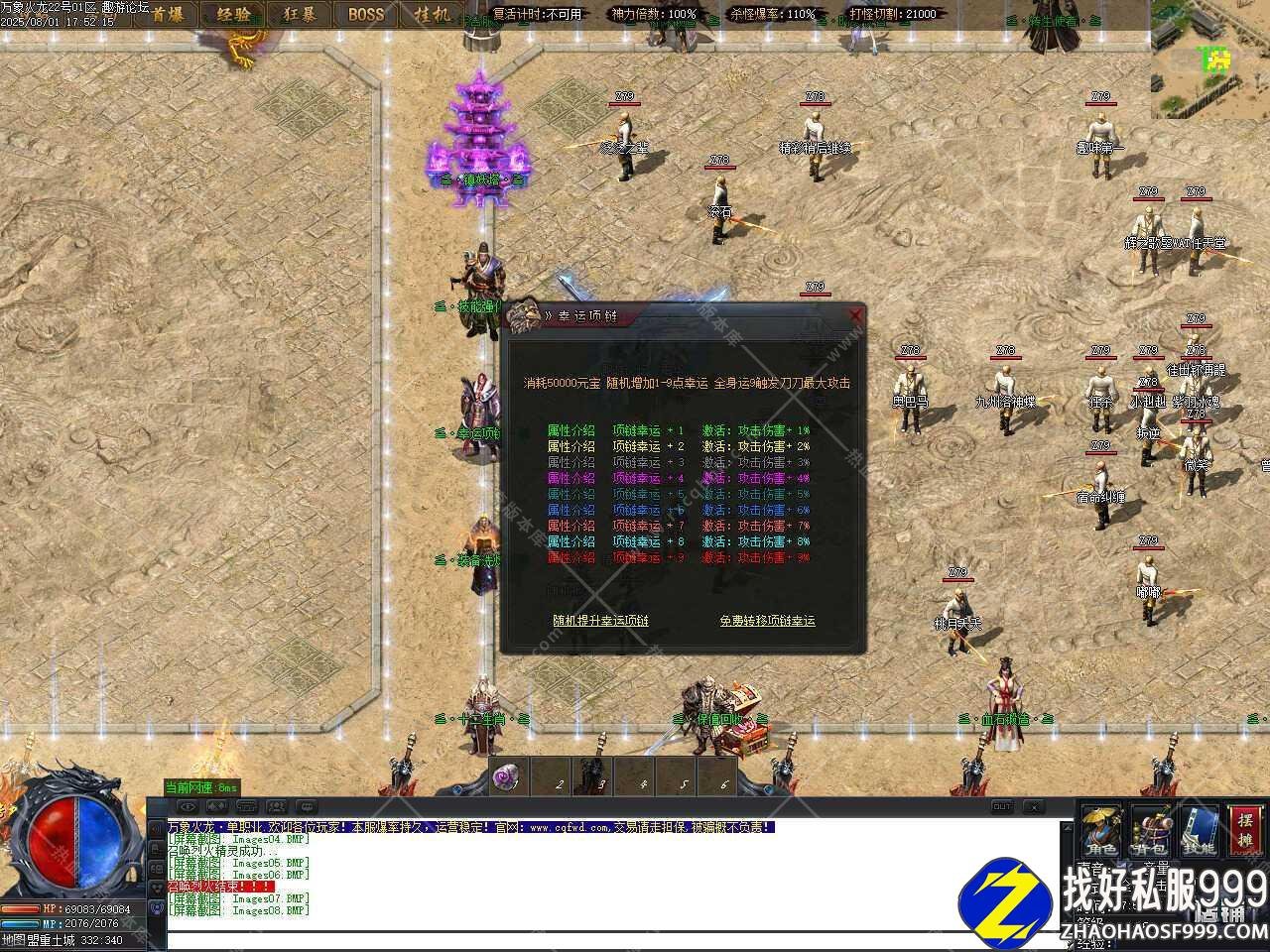 五、新增幸运项链功能,添加一次幸运消耗50000元宝,随机增加1-9点幸运,全身运9触发刀刀最大攻击,项链幸运+1激活攻击+1%;项链幸运+4激活攻击+4% ;项链幸运+9 激活攻击+9%,升级时项链佩戴在身上即可。