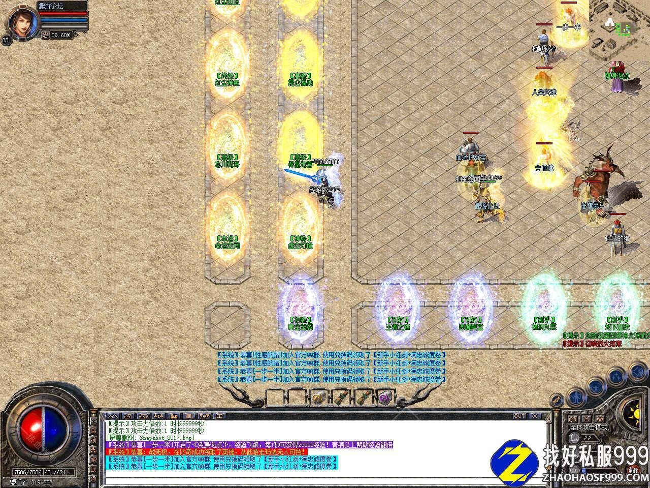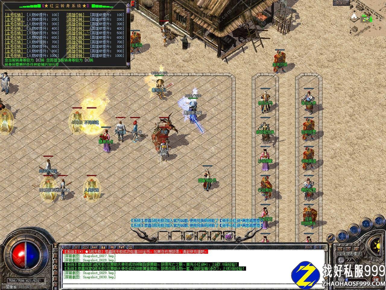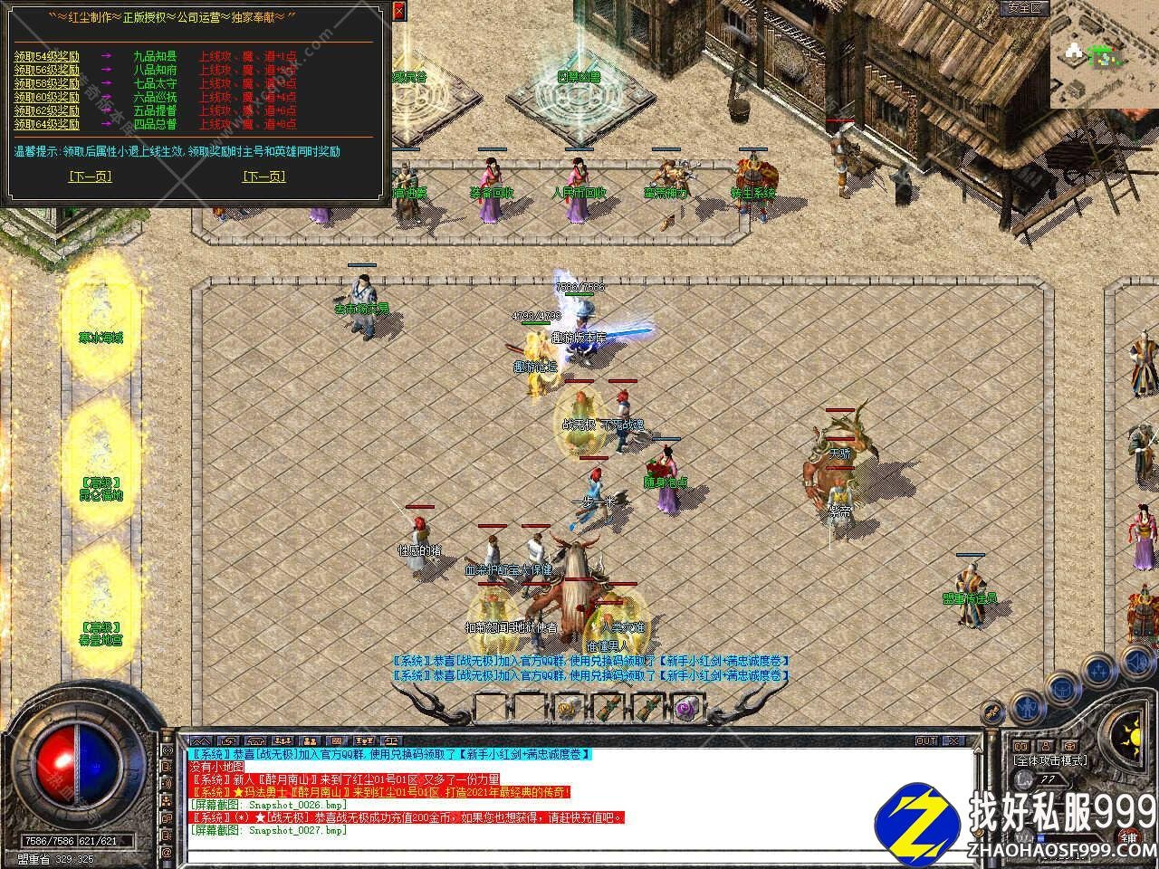 版本介绍:新增多个活动,活动一、每三小时土药刷新树妖、可爆出大量装备、燕玄玉、龍牌等。活动二、每晚20点30活动大厅刷新生死判官、可爆出终极装备、神力碎片!活动三、每晚22点30忘川花海72,53刷新神兽boss,打掉此BOSS可解除漠南清源被封印的天外魔王boss,爆率极高。