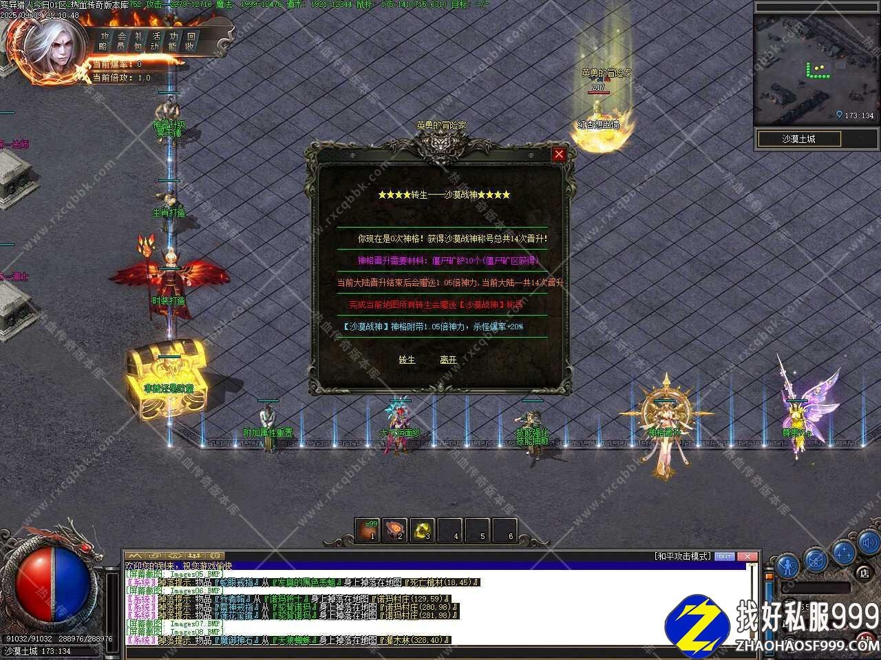三、新增装备变异功能,变异规则:相同2件没有变异的装备可以在我这里变异,首饰盒,生肖,特殊4格不可变异.只能变异图片显示的装备.3种变异方法如下:【免费变异】2个相同的装备+30个变异石+600荣誉点,成功率40%。失败装备破碎消失。【金币变异】2个相同的装备+40个变异石+5000W金币+1200荣誉点,成功率65%。失败装备破碎消失。【元宝变异】2个相同的装备+50个变异石+15000元宝+2000荣誉点,成功率100%。不会失败。注:装备变异后【初始属性*2,隐藏属性*2,套装属性*2】!装备变异后扔地上重新拾取后就有鉴定属性!