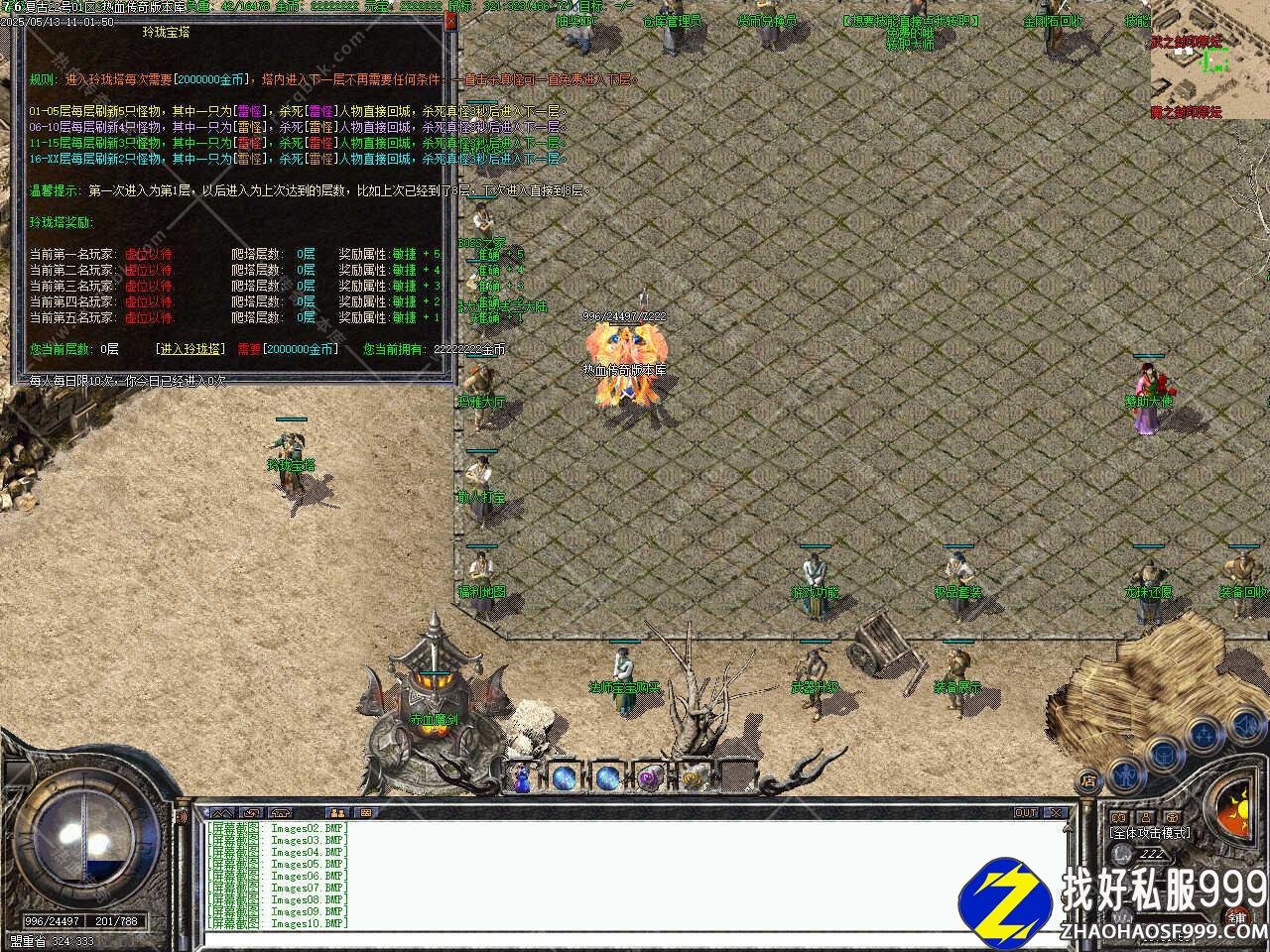 版本介绍:70级可以进天塔,每层刷新BOSS。顶层可以进行战、法、道的九重技能升级天塔顶层可以进入神器大厅,爆各种特殊属性BUFF的首饰盒装备,天塔顶层,75级可以进入3世界,出银蛇装备及各种属性宝石,3世界有NPC可以对装备进行开孔,需要开孔器,由生肖怪爆出,开孔后可以直接免费装上各种属性的宝石,防魔御,攻魔道,准确,攻速等等。