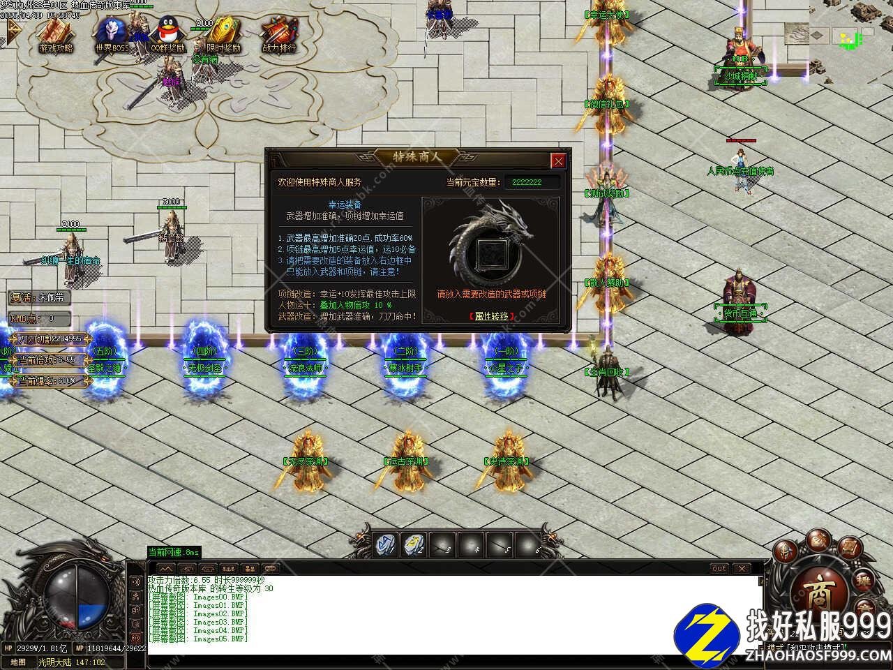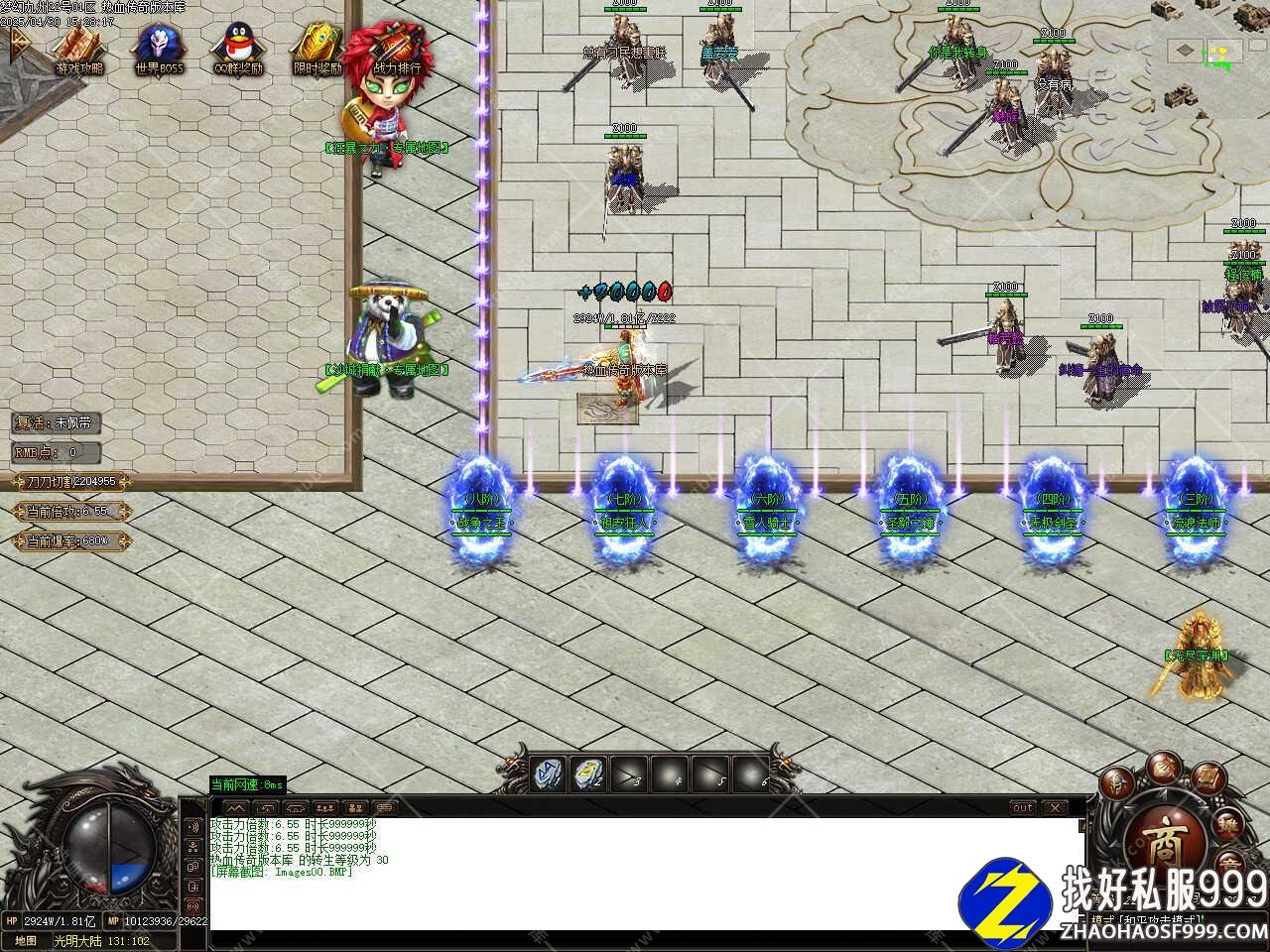 版本介绍:此版本在线泡点到100级之后土城转生升级到120级,进二大地图渡劫升级到130级(建议血量超过80W再去渡劫)打魔王88个可在而大地图召唤魔王BOSS必爆狂暴符经验丹。