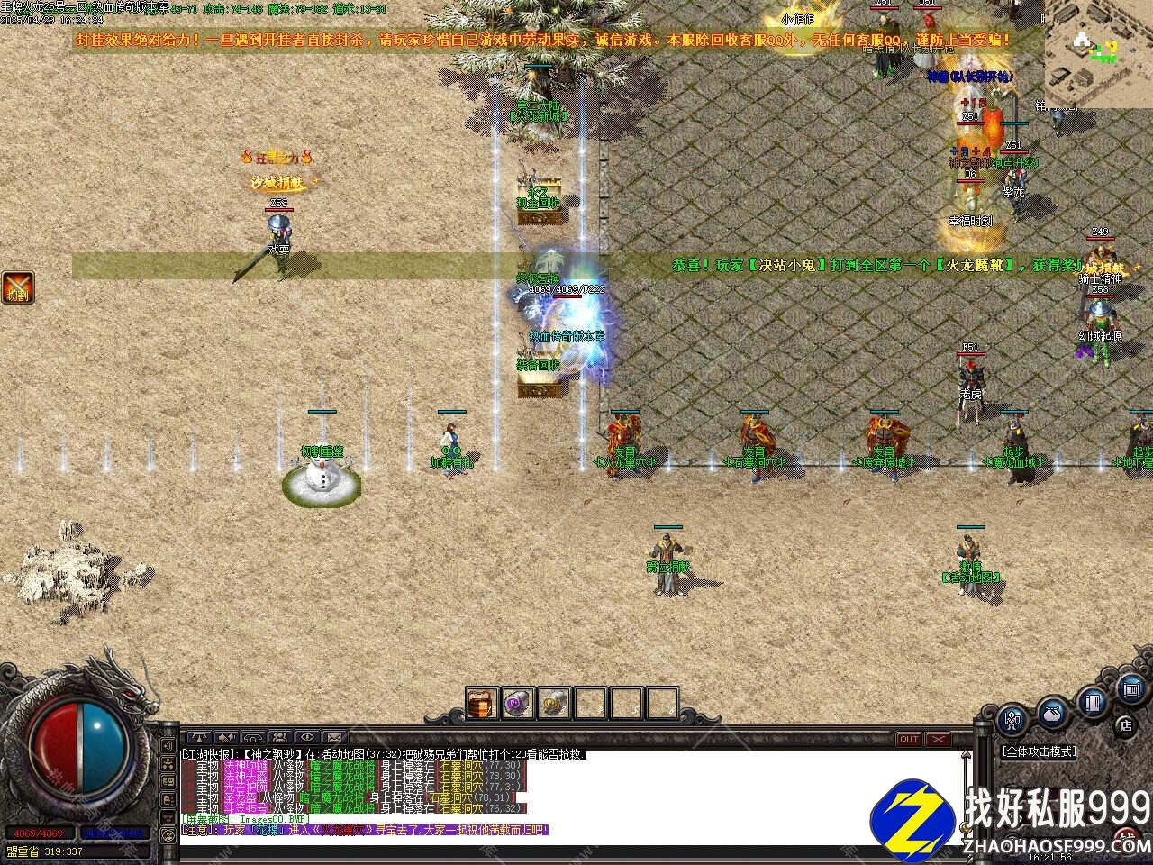 版本介绍:新增武林争霸活动,每天19:10分是武林争霸举办时间,大于40级的玩家才可以进入争霸地图.,活动开启10分钟内可以重复进入地图,10分钟后大门关闭,当场地战斗仅剩最后一人则诞武林盟主,将获得称号,注:场地不允许使用任何药品,禁止使用回城石和随机石,称号附1.1倍属性与天下第一属性奖励不能重叠。