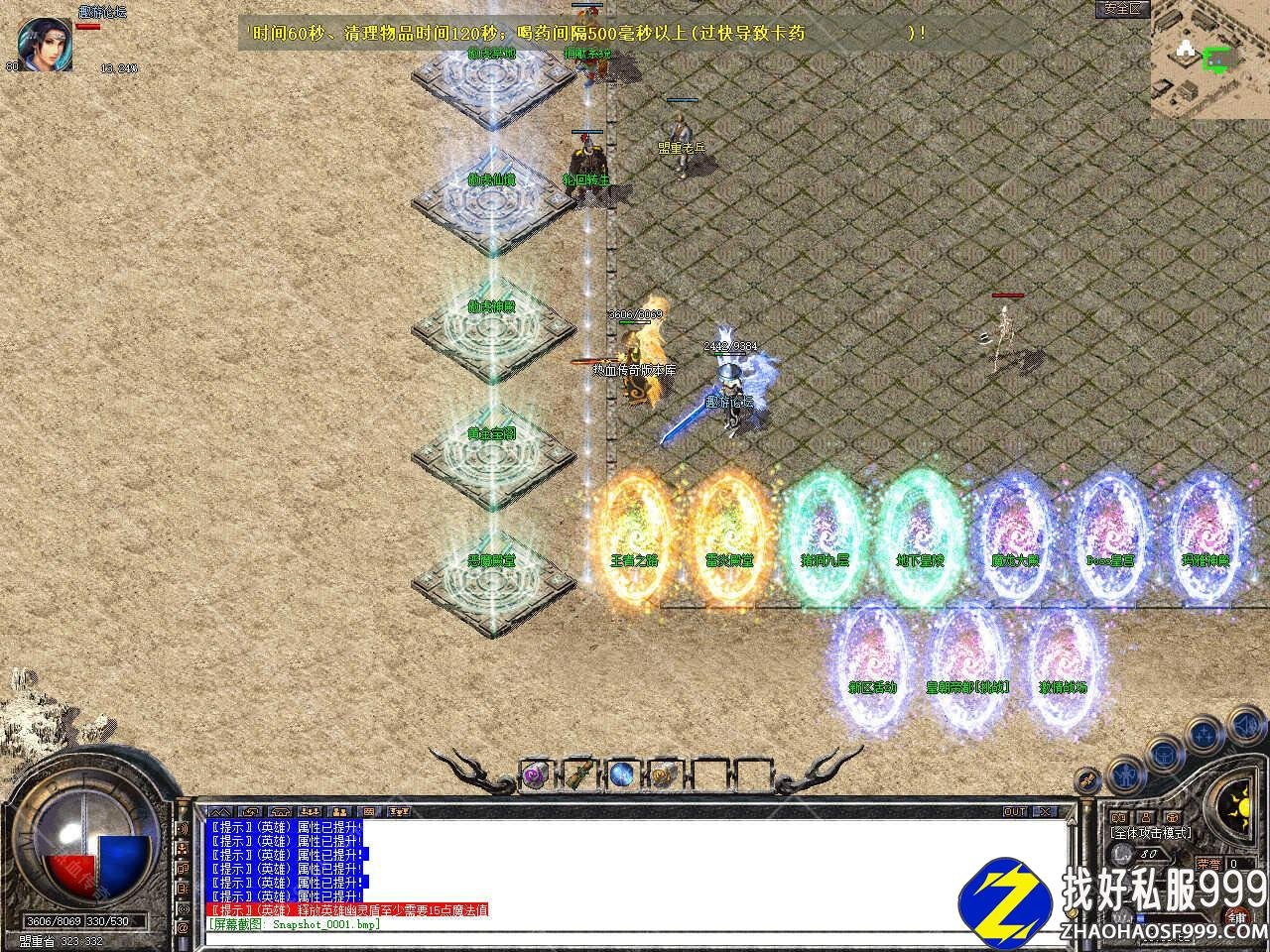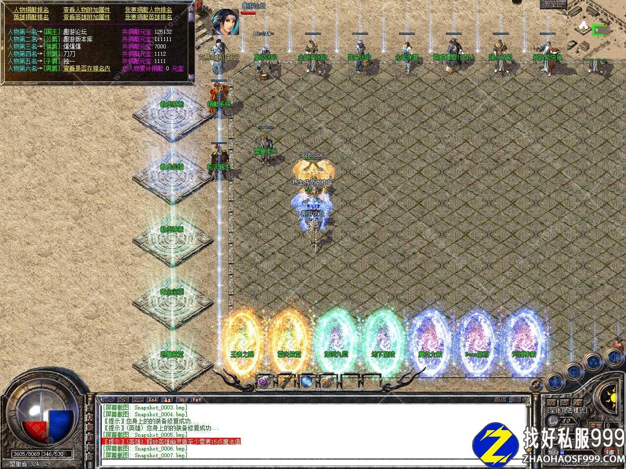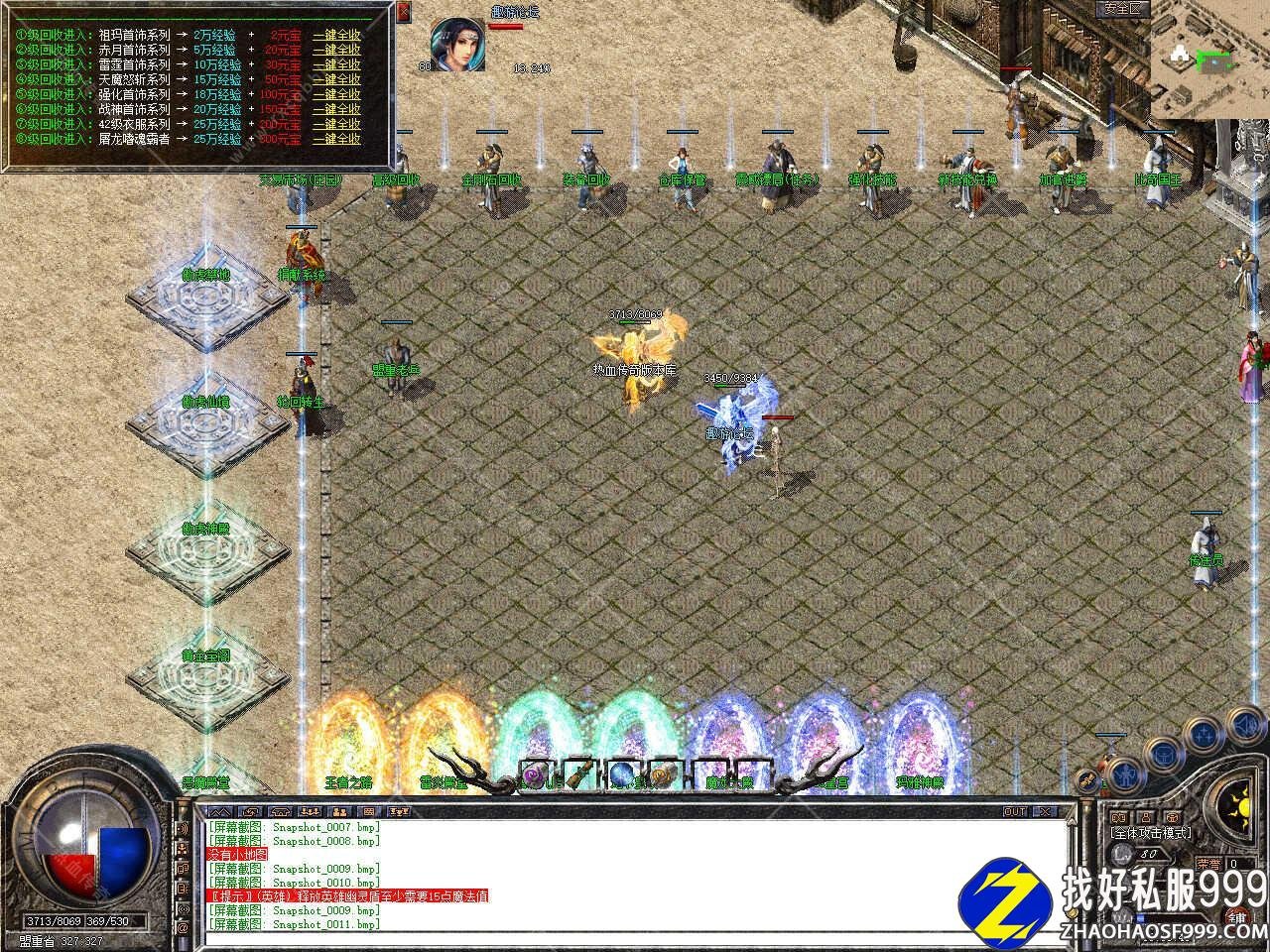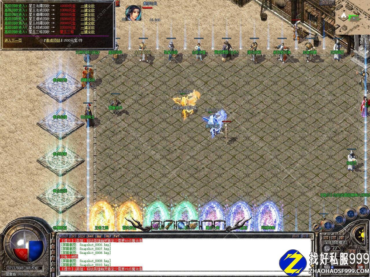 版本介绍:此传奇版本刷怪频率适中,猪9猪10地图、地下皇陵15分钟一刷、终极神殿各种boss云集。藏宝阁、幻境八九十层、血域、王者、玛雅均有BOSS30分钟-1小时,雷炎神殿里雷炎神龙,雷炎蜘王爆本服所有装备,恶魔殿堂,王者之路地图中各种大boss云集,请组队前往;魔龙教主系列30分钟刷新,大BOSS一小时刷新。