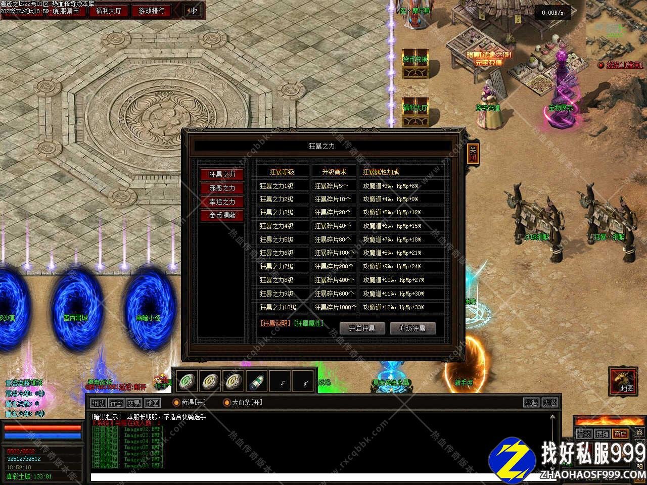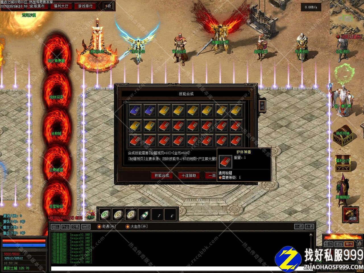 版本介绍:版本采用全新脚本方式制作,画面清爽,地图超多,玩法多样,用心制作的一款传奇版本,新手上线升级去怀旧地图是个不错的选择,本服大量功能在F10按钮处查看。