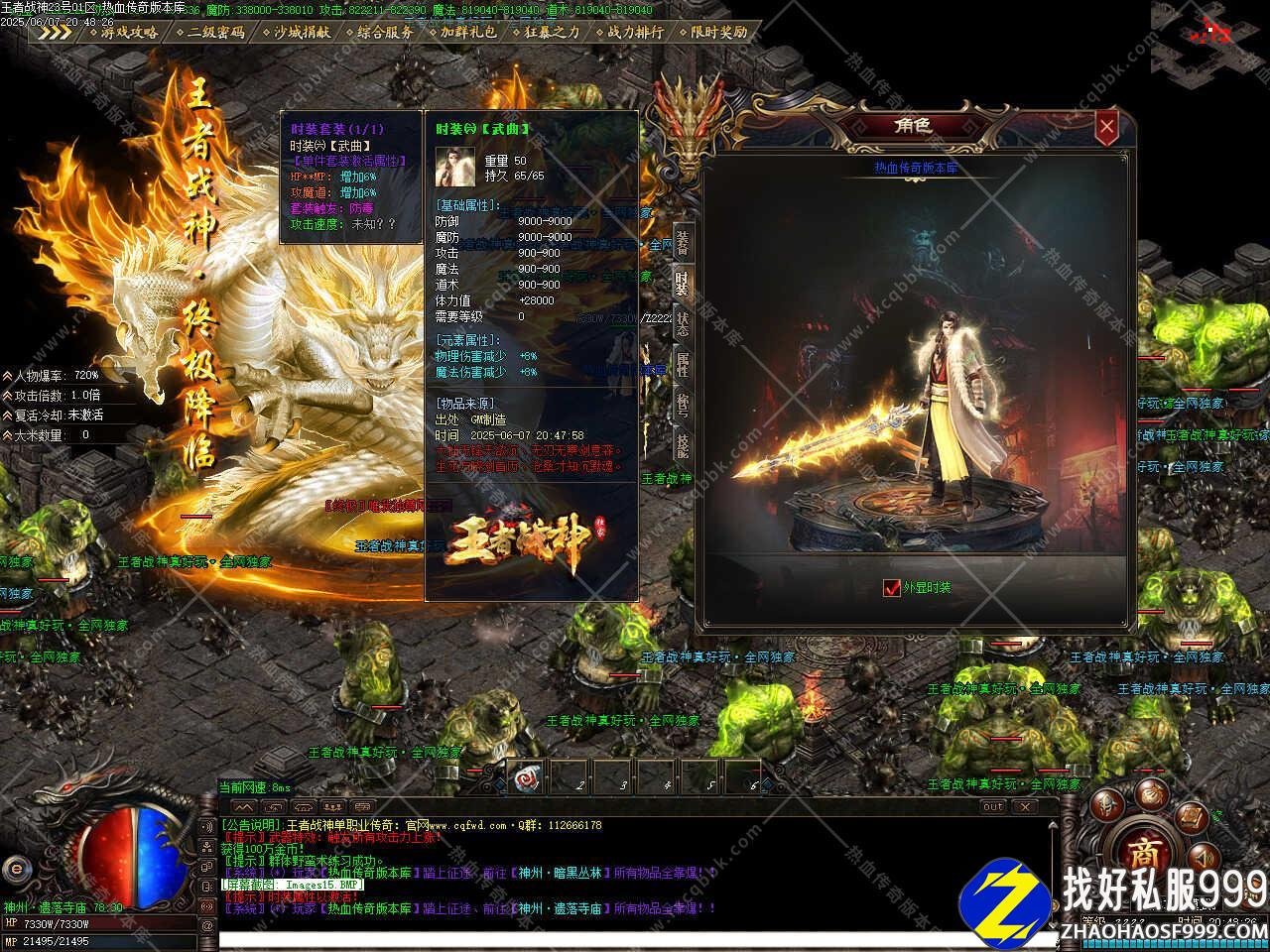 七、本服时装加攻速,升级至满级需要1.5亿元宝,时装为1阶到终极时装,共10阶,需要元宝与材料提升,升级时装材料只有打怪获得,终极时装可触发攻速加成,配合半月弯刀技能刷怪超快。