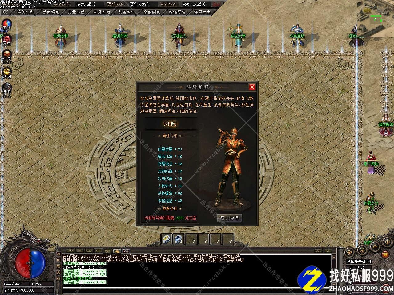 三、新增装备强化功能,成功率50%,强化一次需要金币3000万、加星强化卷50个,全套强化+8激活全属性+6%,打开NPC点击对应装备位置,可选择强化部位。
