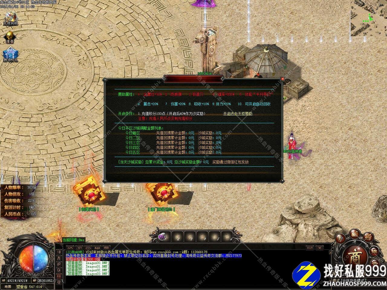 版本介绍:新增测试奖励功能,测试打到装备回收获得元宝,正式开区可领取50%元宝。测试回收装备获得的元宝,系统自动记录,无需手动记录,正式开区后人物登入后系统自动奖励到角色,不需要手动领取!