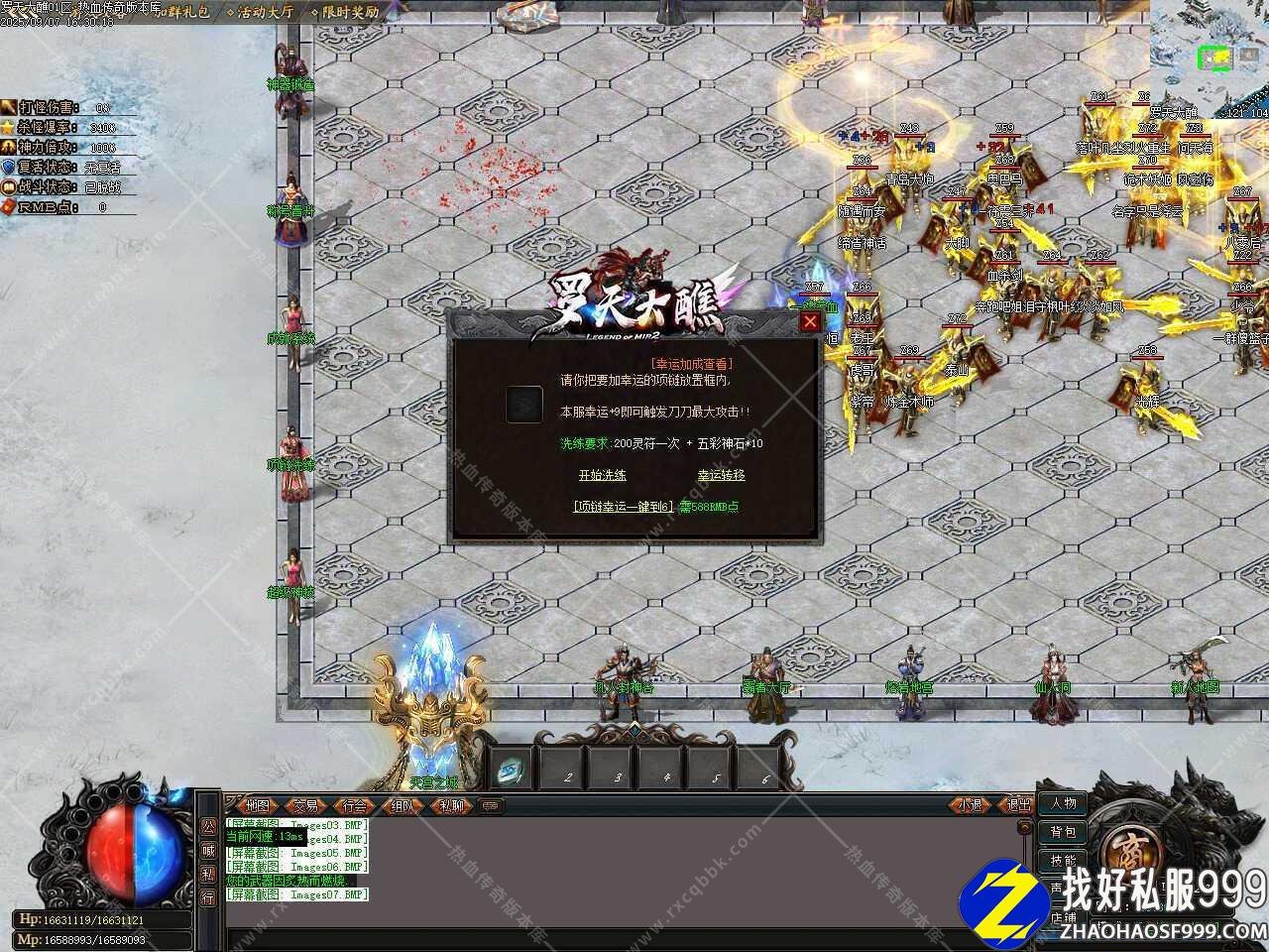 四、新增幸运项链功能,链幸运5点:打怪伤害加成10%,项链幸运6点 打怪伤害加成20%,项链幸运7点:打怪伤害加成40%,项链幸运8点:打怪伤害加成60%,项链幸运10点:打怪伤害加成100%(额外奖励神力倍数1.10倍),本服幸运+9即可触发刀刀最大攻击。