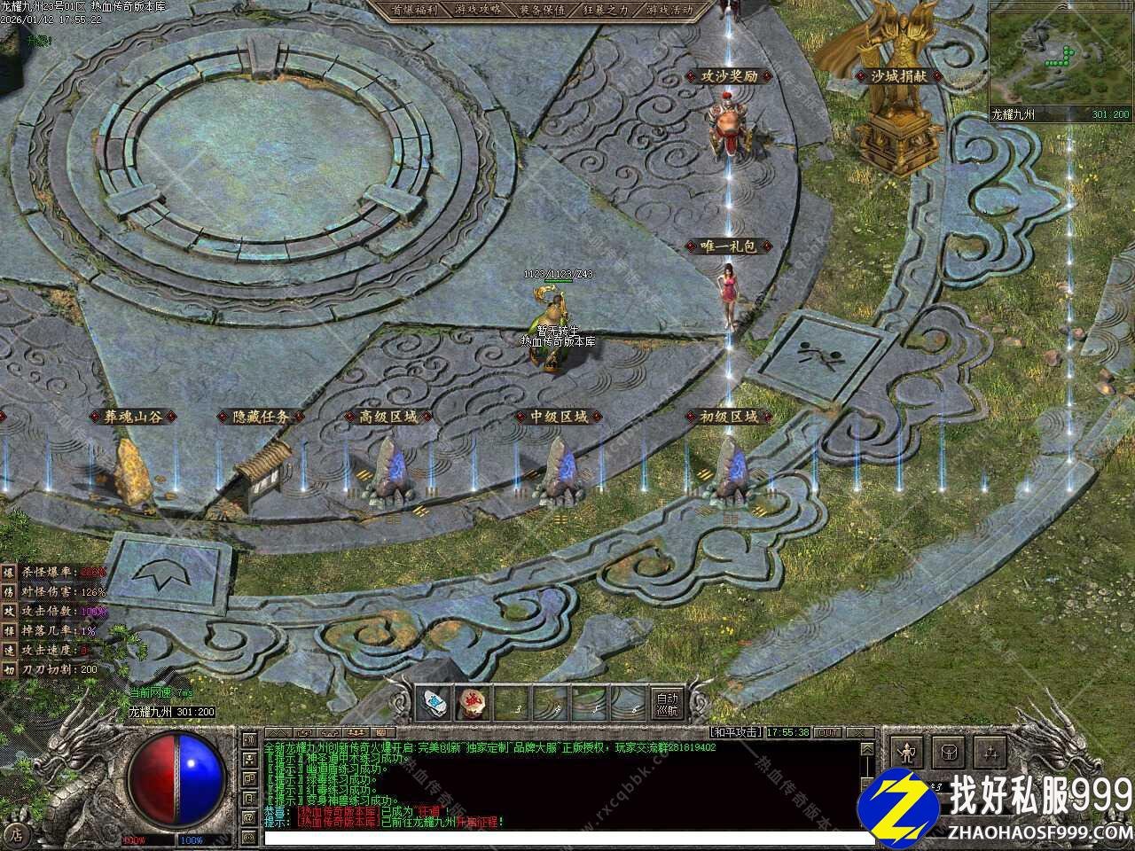 二.本服升级很快,打怪速升级到80,打到聚灵珠可以在等级使者那里升级,等级使者NPC所在位置在一大陆龙耀九州290 184处。同时转生也不难,一大陆转生处只要打青龙神石即可,转生使者NPC所在位置在一大陆龙耀九州292 184处。