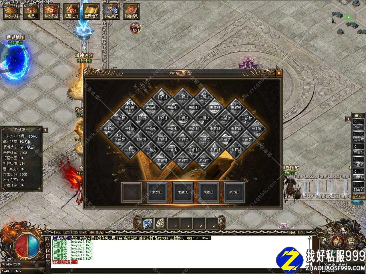 四.新增潘神迷宫活动,开启时间为每天12.00 15.00 19.00 23.30,开启入口300秒后关闭入口,02:00至08:30不关闭,可一直进入(8.30自动传出迷宫内所有玩家),潘神迷宫强制和平模式,每次进入限制[180]分钟后传出,潘神迷宫共有12层,开启大荒古都后可进入4-6层,打开域外之门后可进入7-9层,开启始祖界之后可进入10-12层,开启狂暴即可免费进。