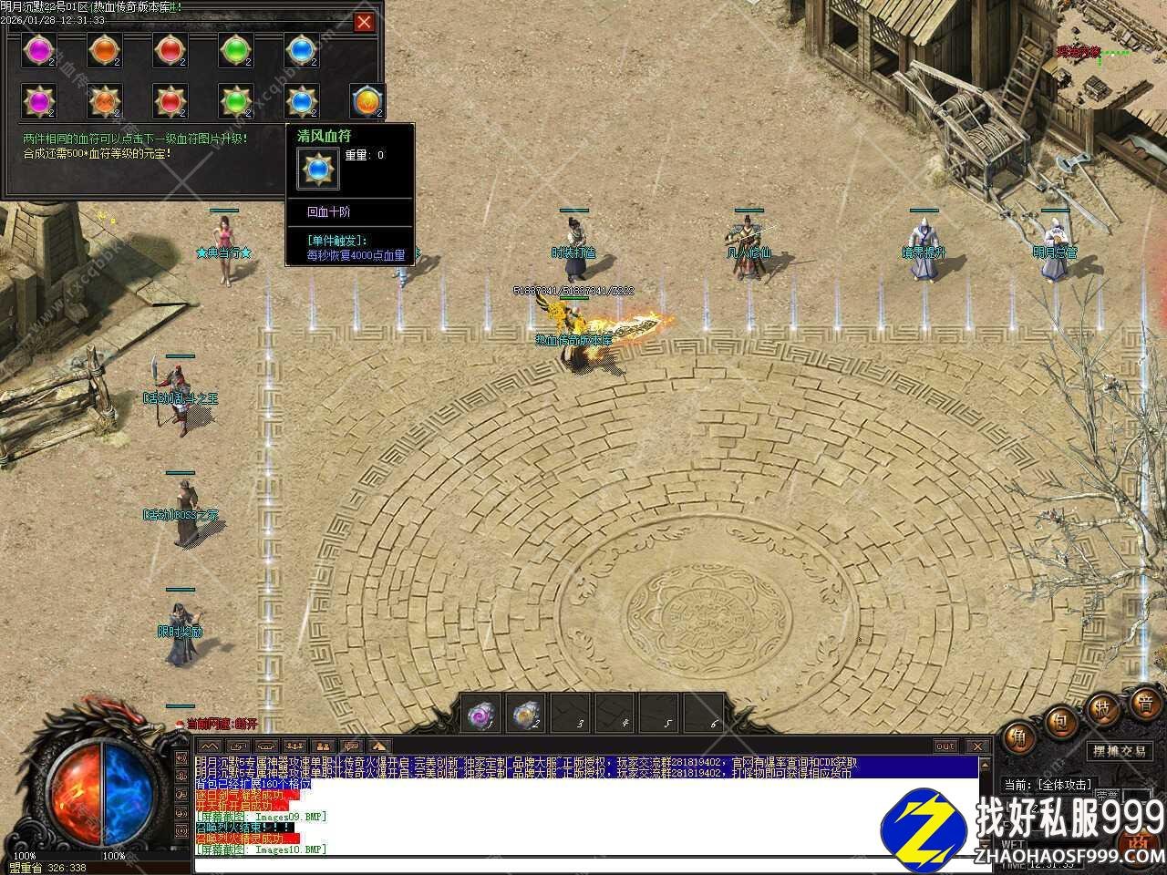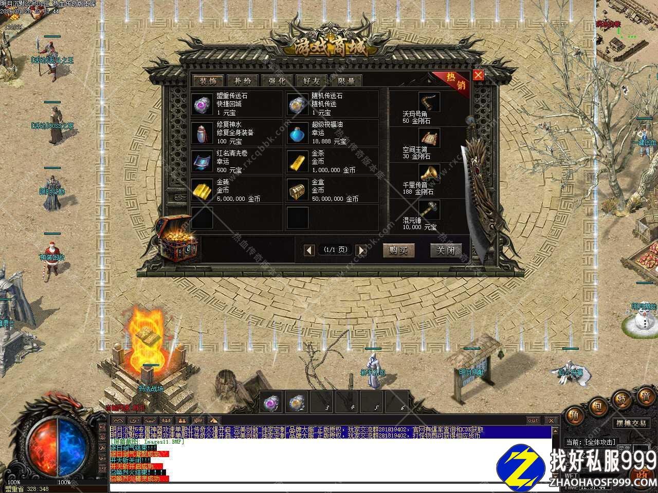 三.取消回城石读条,取消了挂机的各种限制,取消穿戴脱下就触发属性刷新改为30秒刷新,修改回城石随机石为无限使用石头,修改综合服务按钮为货币兑换,修改一下面巾斗笠素材的错位,修改将土城书店的一个买爆率NPC挪到土城。