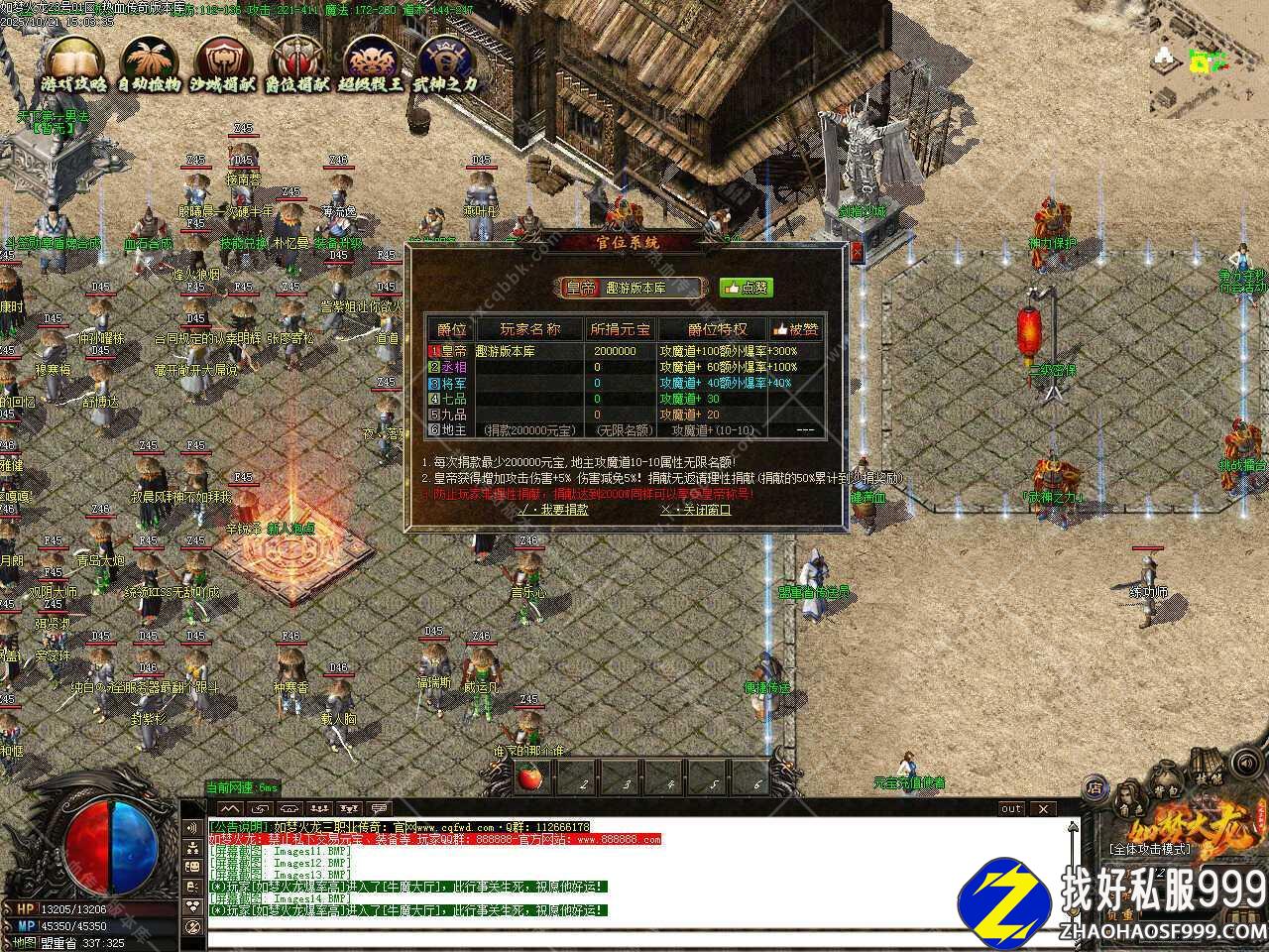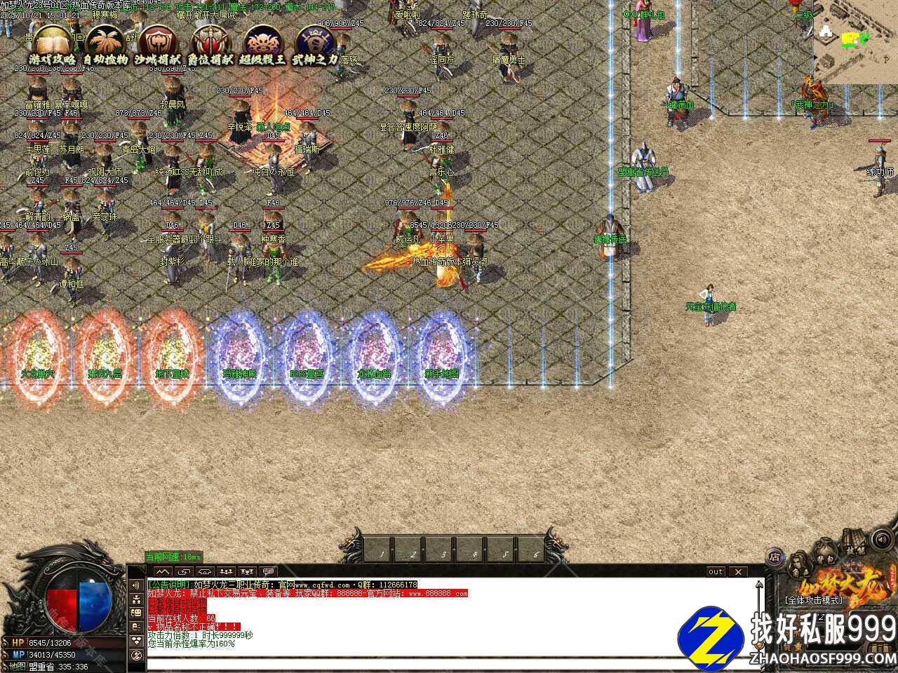 四.此服务端中新增全服喇叭功能,玩家可以全服发布信息,此信息显示在屏幕正中间,从右向左飘出,全服都能看见!高端大气上档次,为了防止刷屏,每次喊话需要1000元宝。