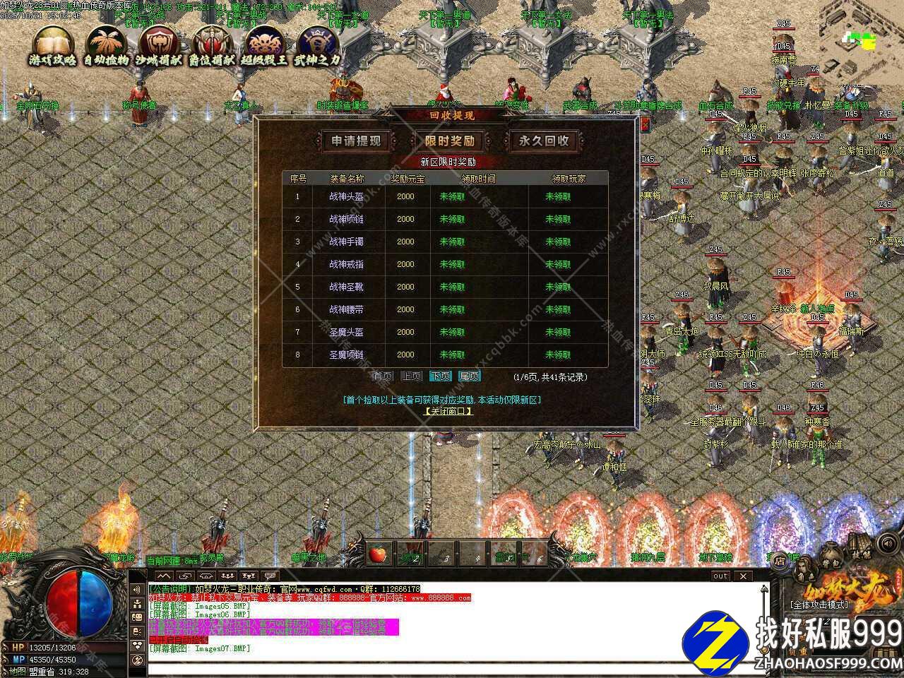 五.新增武神之力功能,如果有99999,可以帮你开启武神之力助你斩尽妖魔,武神之力开启后会获得攻魔道各+50点,被怪物打掉或者下线不消失,被玩家打掉后封号消失,同时打掉武神之力的玩家可获得48888元宝。