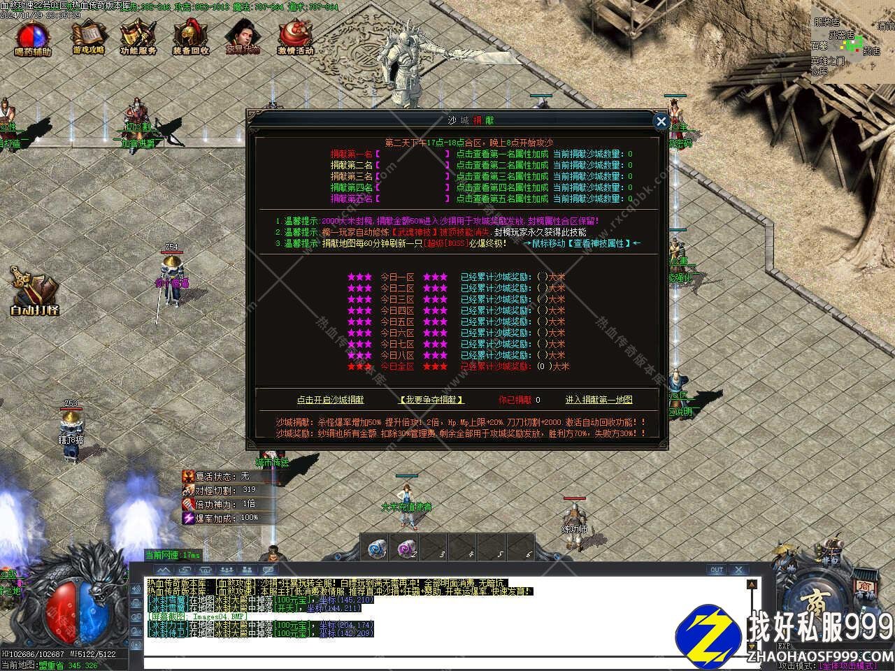 版本介绍:开区第二天下午17-18点左右合区,晚上20点开启攻城,沙奖丰厚,拿沙是传奇的经典玩法,只有拿沙才能体验到真正的热血传奇。