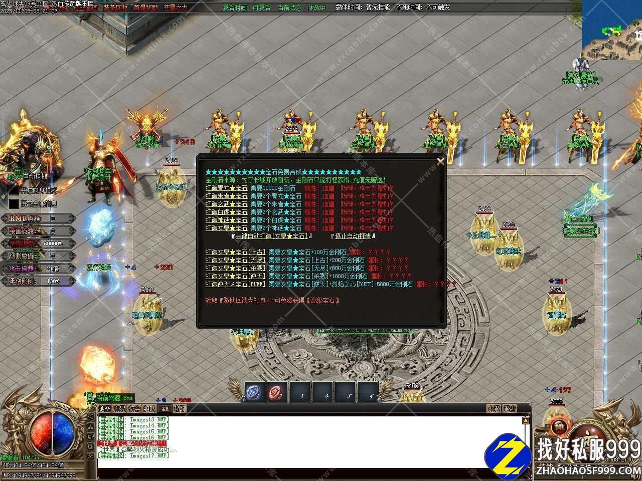 三.新增宝石合成功能,打造青龙宝石需要10000金刚石,打造朱雀宝石需要2个青龙宝石,以此类推,上面还有玄武宝石、白虎宝石、神话宝石、女皇宝石,宝石可增加一定的防御和攻击力,合成时根据自身材料自动购买初级材料,自动打造,消耗与手动点击一样,请背包保持最少10个以上空格,否则无法自动打造。