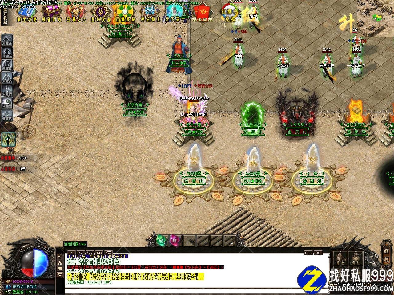 版本介绍:在主城地图按部就班的打点装备,所有地图都可以边打怪边泡级,多的装备可以回收武侠币,土城上面可以升级称号、时装、转生、武学来提升自身实力,泡到400级升到10转去土城左上角下二大陆继续提升实力。