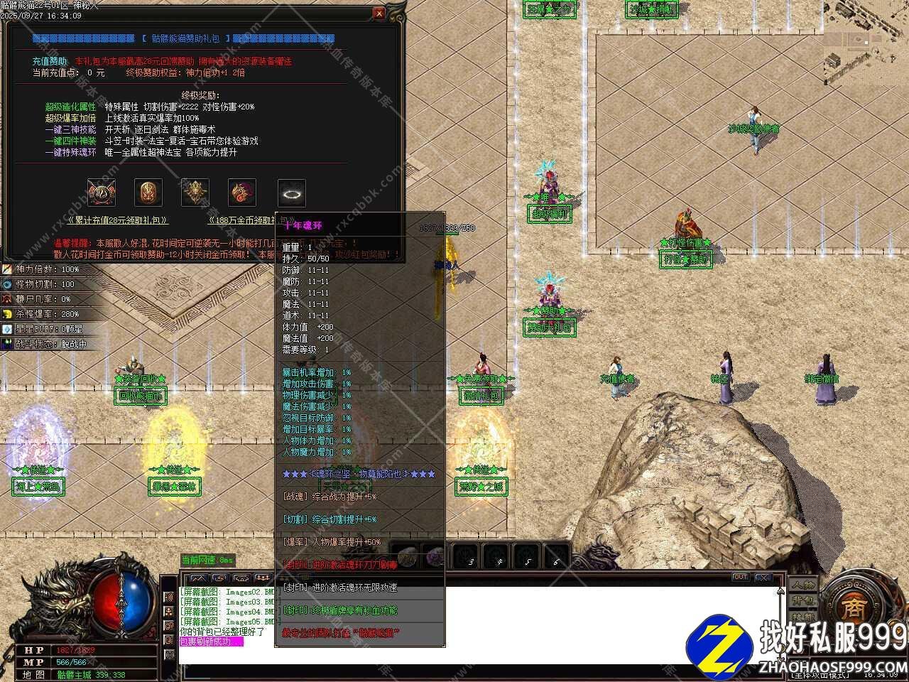 六、新增赞助礼包功能,本礼包为本服最高28回馈赞助,拥有强大的资源装备赠送,上线激活真实爆率加100%,特殊属性 切割伤害+2222 对怪伤害+20%,一键特殊魂环,唯一全属性超神法宝,各项能力提升。