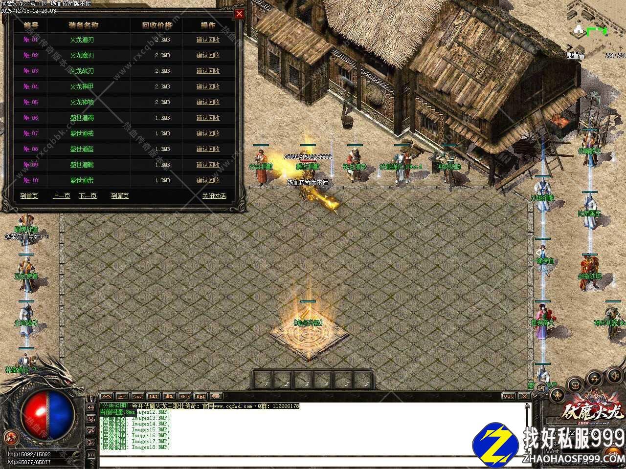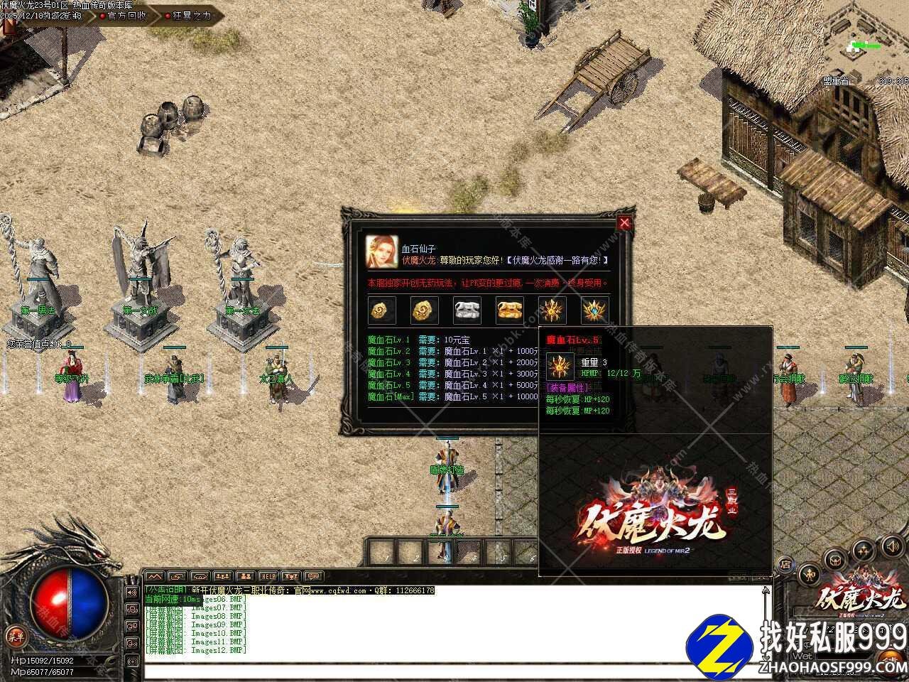 九.新增装备升级功能,升级时打开NPC把你要提升的装备带在装备栏内即可,攻魔道防魔6000元宝提升1点。首饰系列最高提升3点,武器衣服最高提升7点,100%成功,提示:请佩戴好装备再进行升级,如不佩戴进行升级,会出现扣除元宝的情况。