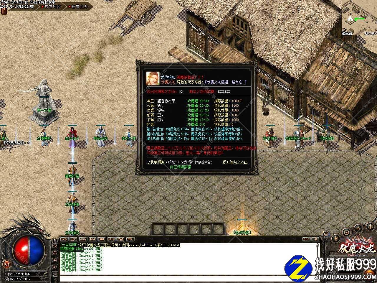 八.此传奇版本新增了行会捐献功能,每人都可为自己行会捐献元宝,排行第一名的行会可获得属性奖励,<榜上行会成员可获得攻魔道15-15、HP+100、MP+10的属性,合区后新老区行会捐献排名全部清零,可再次捐献。