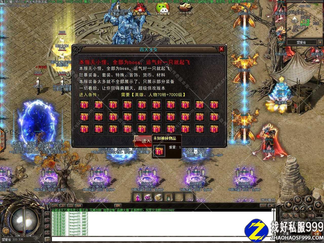 二.本服地图多,设置多倍爆率BOSS,玩家上线即可挑战1-2倍BOSS,但是需要自身强大,如果没有好的装备打高怪会有点费力气,一量打出武器了就可以挑战更高的怪物了,怪物爆率方面不同怪对标不同的多倍爆率怪物,碰到高HP的BOSS前期躺着点,定身特殊很重要,在土右上角合成,有这个打BOSS就简单多了,一定要记得循序渐近。