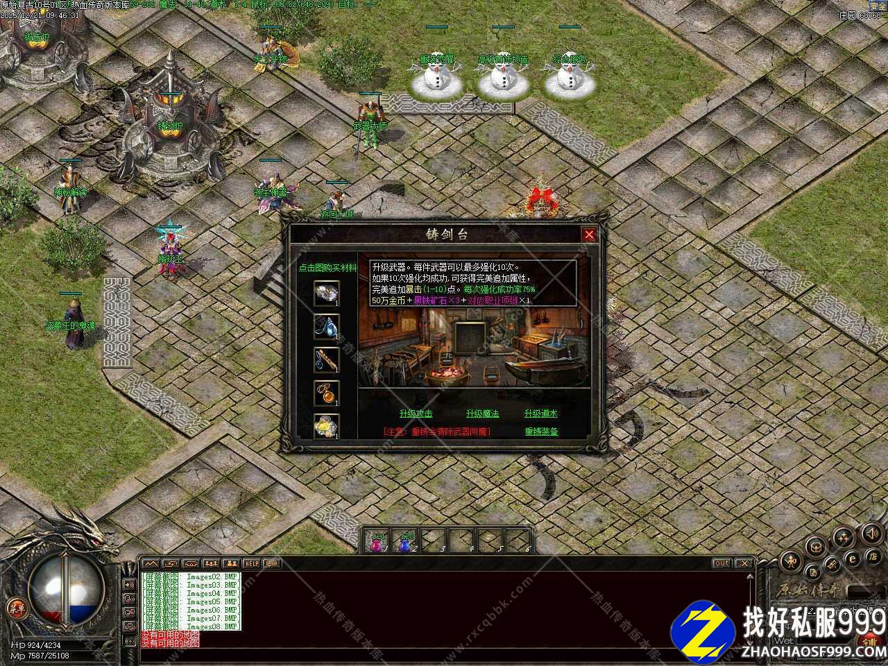 五.新增武器强化升级功能,每件武器可以最多强化10次,如果10次强化均成功可获得完美追加属性,完美追加暴击,每次强化成功率50%,升级一次需要50万金币和黑铁矿石3个,武器升级可附加攻击、魔法和道术。