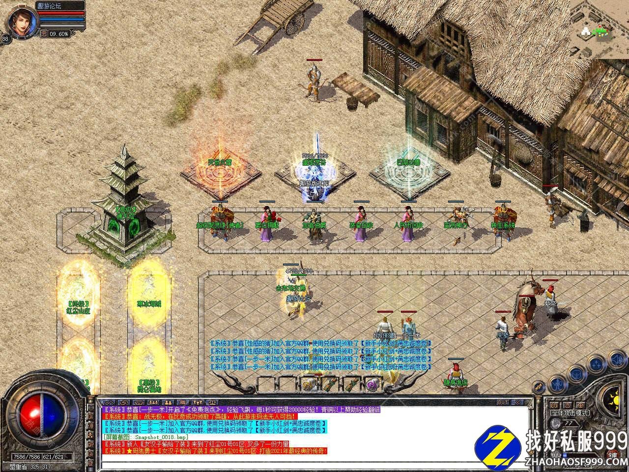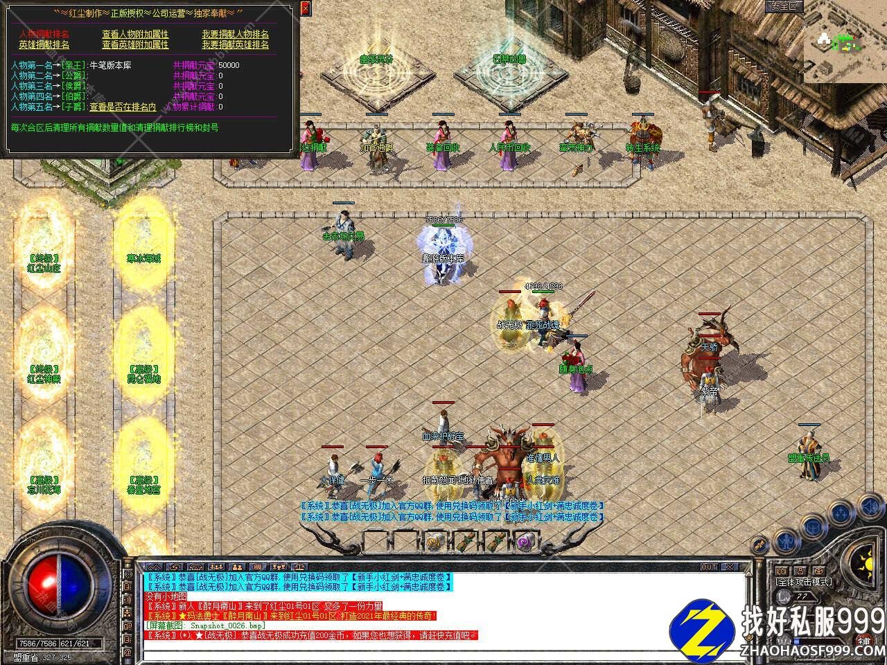 版本介绍:新增多个活动,活动一、每三小时土药刷新树妖、可爆出大量装备、燕玄玉、龍牌等。活动二、每晚20点30活动大厅刷新生死判官、可爆出终极装备、神力碎片!活动三、每晚22点30忘川花海72,53刷新神兽boss,打掉此BOSS可解除漠南清源被封印的天外魔王boss,爆率极高。