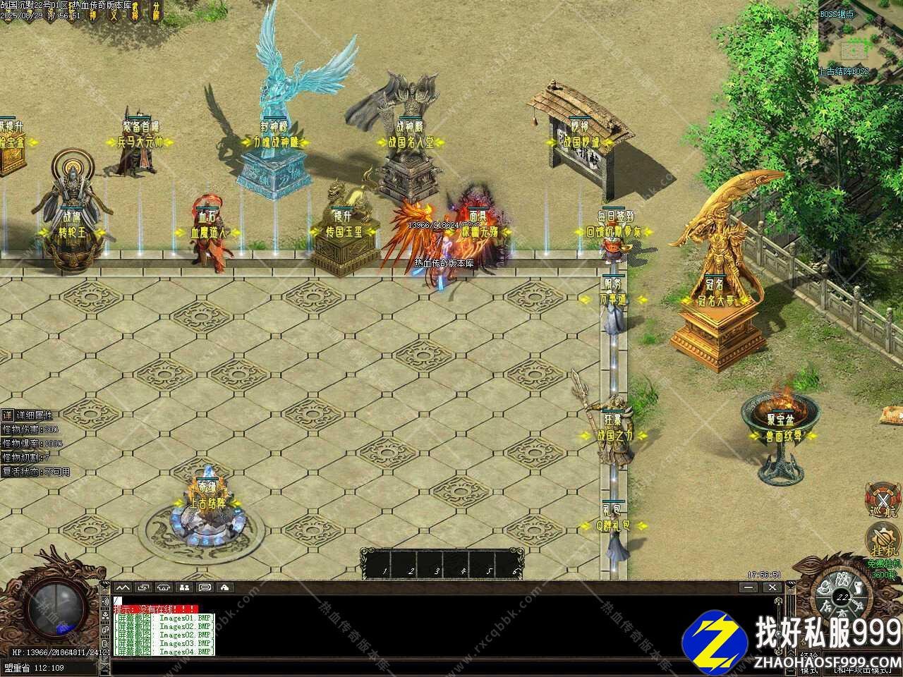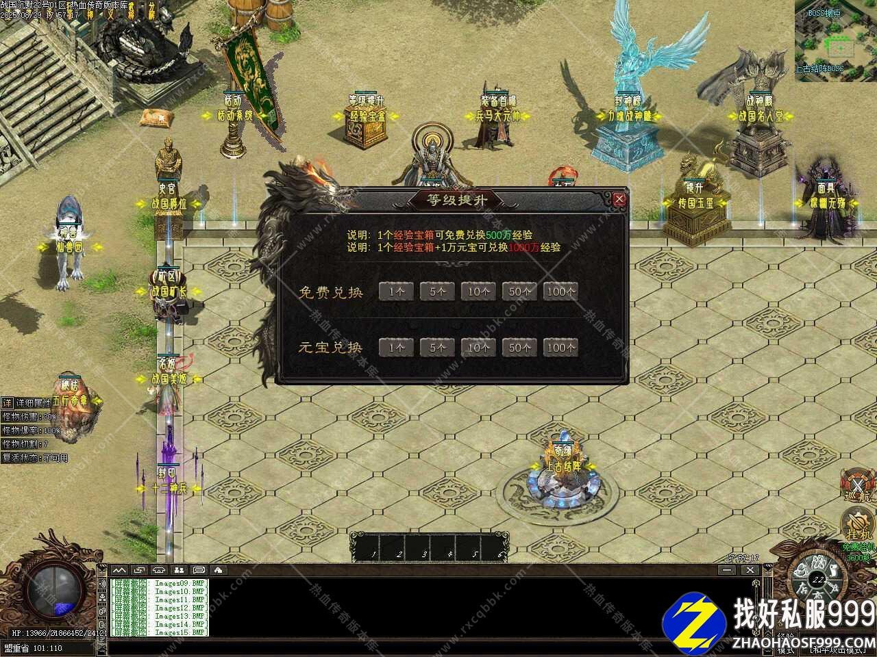 二、添加上古结阵功能,可以把没用的材料,装备,等投入结阵,每投入1次装备材料,上古结阵增加1层,奖励相应的元宝!投入的物品品质越高,得到的元宝越多,结阵每8888层土城药店刷新一只超级BOSS,珍惜材料、终极装备不是梦。