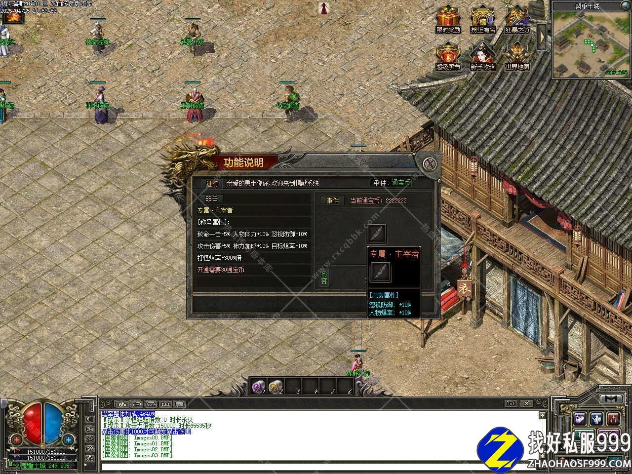 版本介绍:新增捐献称号,捐献可获得专属主宰者称号,称号属性有致命一击+5%、人物体力+10%、忽视防御+10%、攻击伤害+5%、神力加成+10%、目标爆率+10%、打怪爆率+300%倍,开通需要30通宝币。