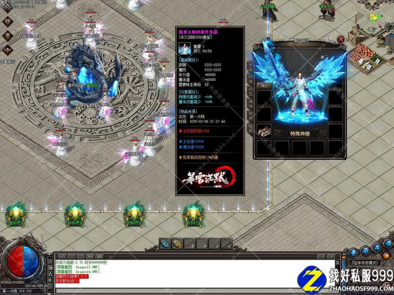 版本介绍:新增加幸运和幸运洗**能,身幸运+9 触发刀刀最大伤害,项链幸运+1 需10000元宝,成功率50%;项链幸运+2 需10000元宝,成功率30%;项链幸运+3需10000元宝,成功率10%,项链幸运+3时随机获得1-10%暴击,洗炼需项链幸运+3一个,同时扣除5000金元,随机洗炼1-10%暴击。