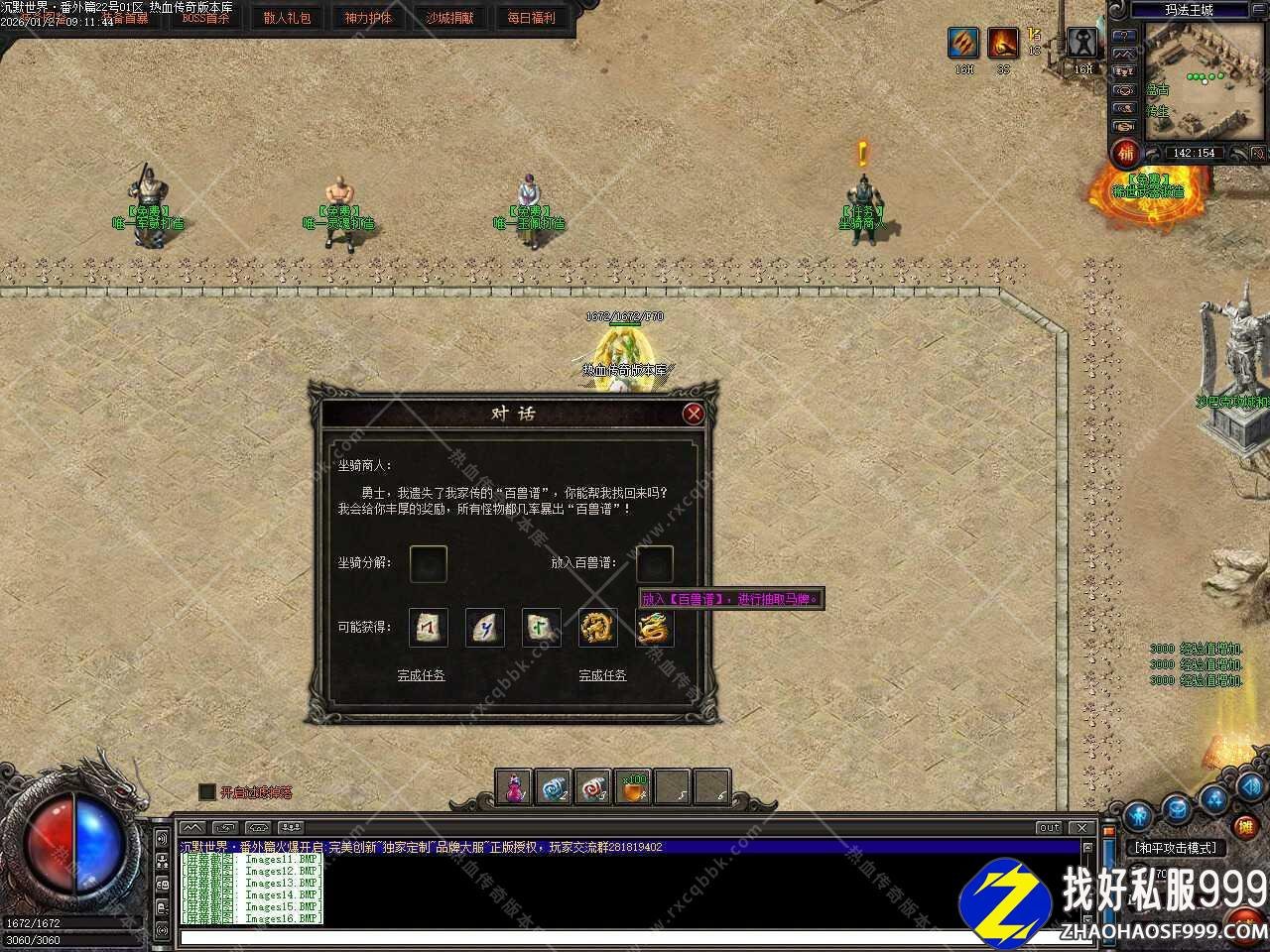 二.本服有抽取坐骑功能,打开宝藏抽奖npc后,放入百兽谱,进行抽取马牌,所有怪物都几率爆出百兽谱材料,随机获得烈焰豹、九尾狐、黑麒麟等马牌,全凭运气。