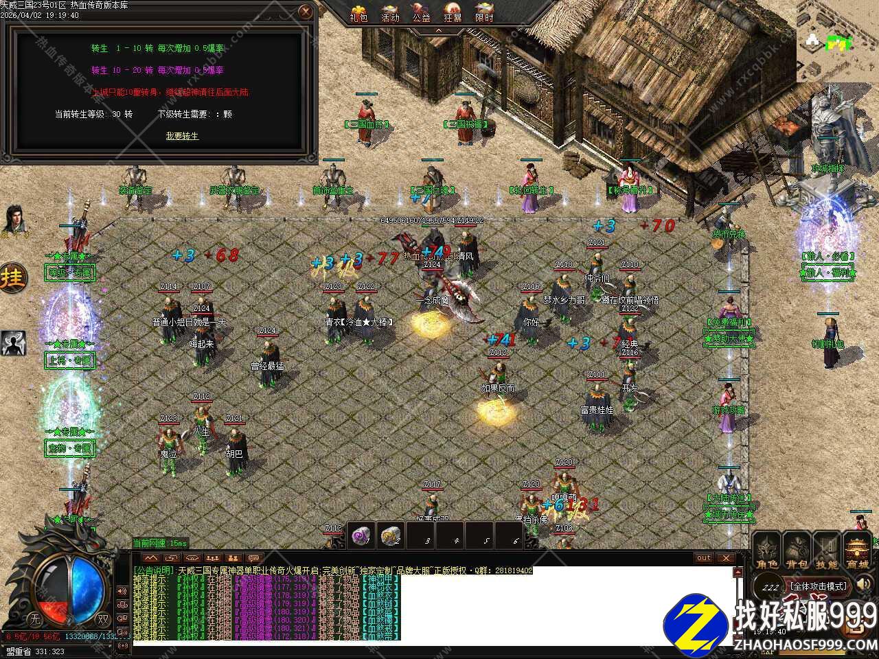 六.本服转生之后会增加附加属性,转生1-10转每次增加0.5爆率,转生10-20转每次增加0.5爆率,10转以后在二大地图中可以继续轮回到20重,转生所需材料在平常打怪中都有爆出,不要忽略不捡哦。