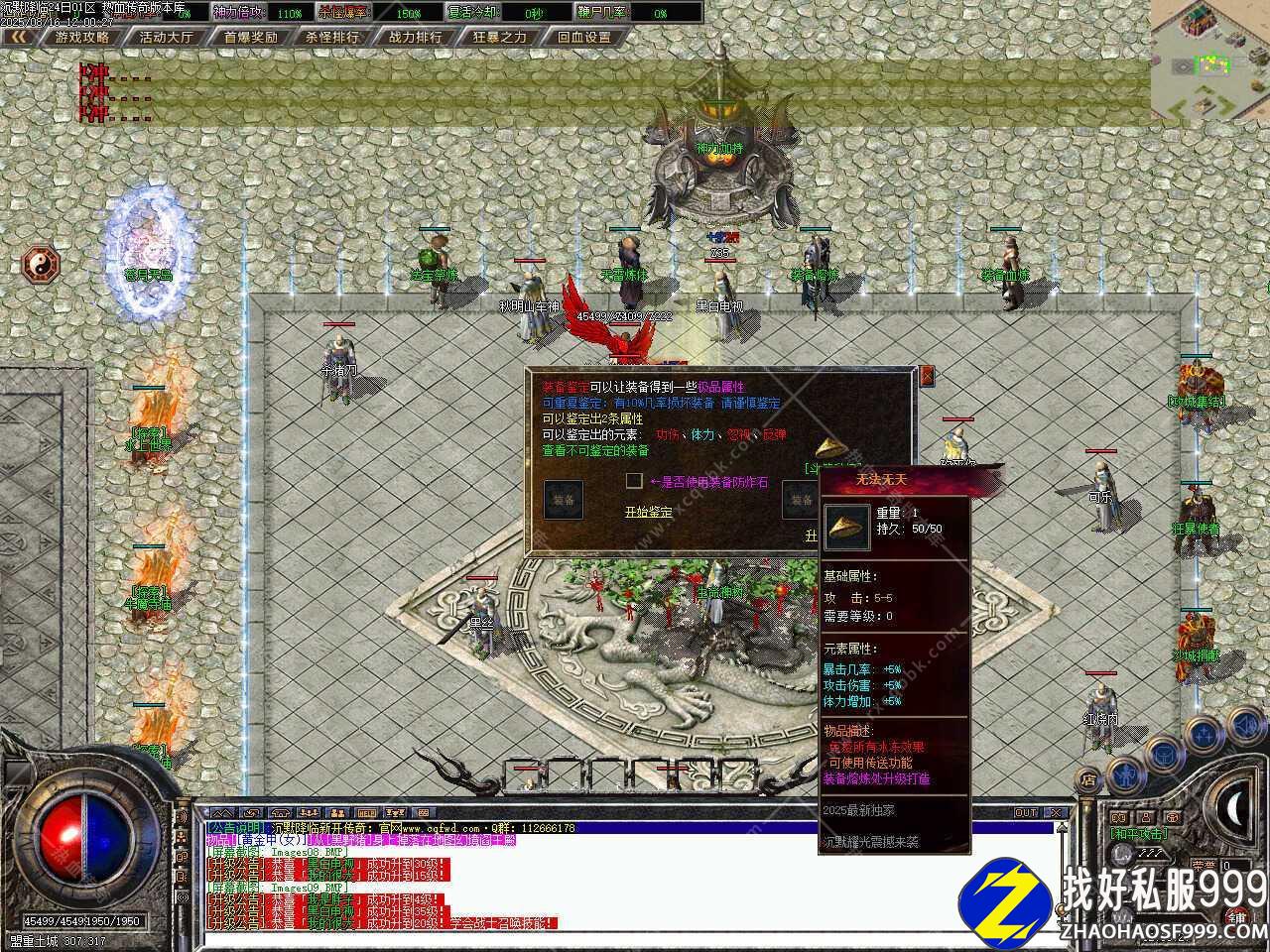 三、新增装备鉴定功能,高级装备可以在我这鉴定,每件装备只能鉴定一次,可以鉴定出多种元素,斗笠,头,连,勋章,手,戒,腰带,靴子,魂环,12生肖均可鉴定攻伤、体力、忽视、反弹、魔法伤害减少等,以上属性随机出两条,加1-5点,装备有10%的概率失败损坏,谨慎鉴定。