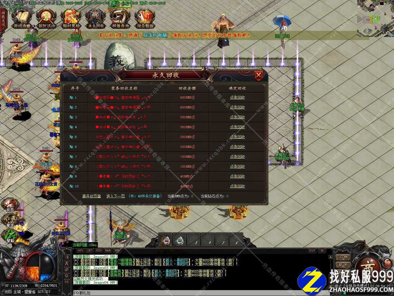 四、本服最高350级,之后穿装备+等级,350级以后额外每级增加0.03倍攻击倍数,所有地图都有几率爆出保值装备,二大陆、四大陆、七大陆、八大陆定点刷新BOSS,每10分钟刷新一次。