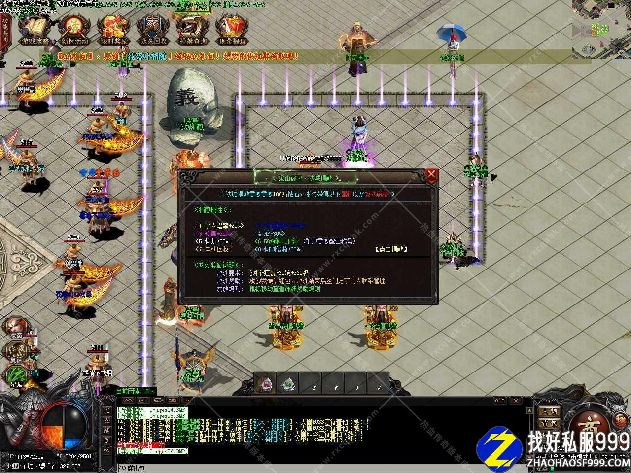 三、土城左上角锻造“聚义宝珠”,充值数量越高爆率越高,自行探索,激活“沙城捐献”拥有超强BUFF属性,尤其是【星辰切割翻倍及额外增加50%BUFF几率】,本服选择性赞助“最高500”可激活相应的符文BUFF。