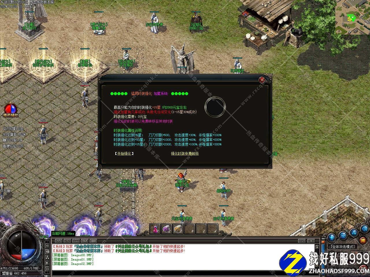 版本介绍:新增时装强化功能,最高只能为你的时装强化+15星,约2000元宝左右,强化加星有几率成功,失败无任何变化,1-15星30%成功,,强化后的时装可以免费转移至其他时装,时装强化达到+5星,刀刀切割+500, 攻击速度+30%, 打怪爆率+100%。