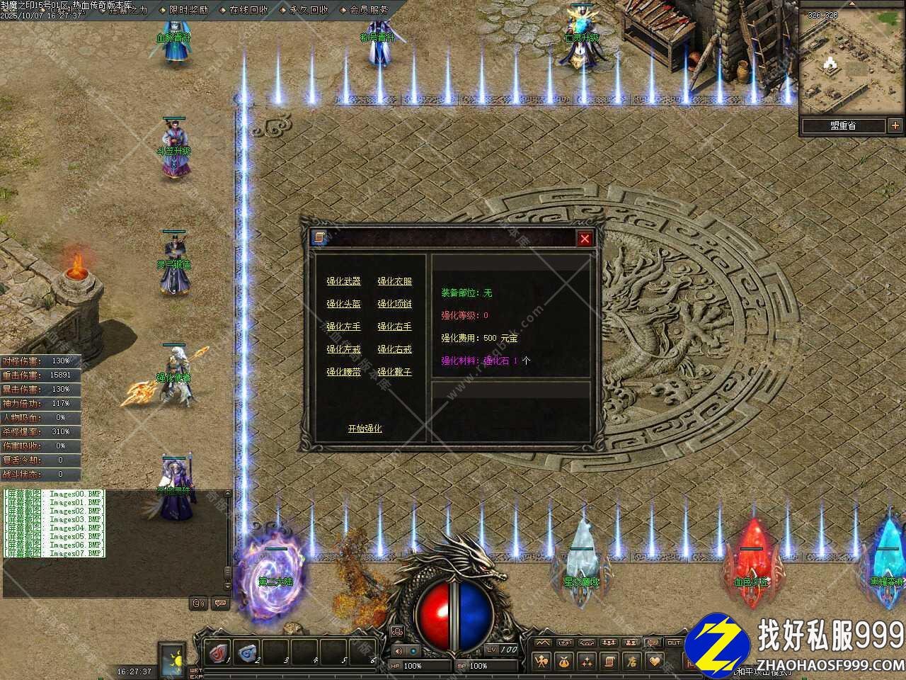 六、新增装备强化功能,武器衣服首饰等都可以强化,每强化一次攻魔道+5,各强化档位属性+2,附爆率增加10%;+2套附加开天,逐日,烈火,十步一杀强化到1重;+12套附加开天,逐日,烈火,十步一杀,魔法盾强化到11重,魔法盾11重复带被攻击冰冻对方2秒,每次强化需要对应的强化石,强化失败只收取强化石和元宝。