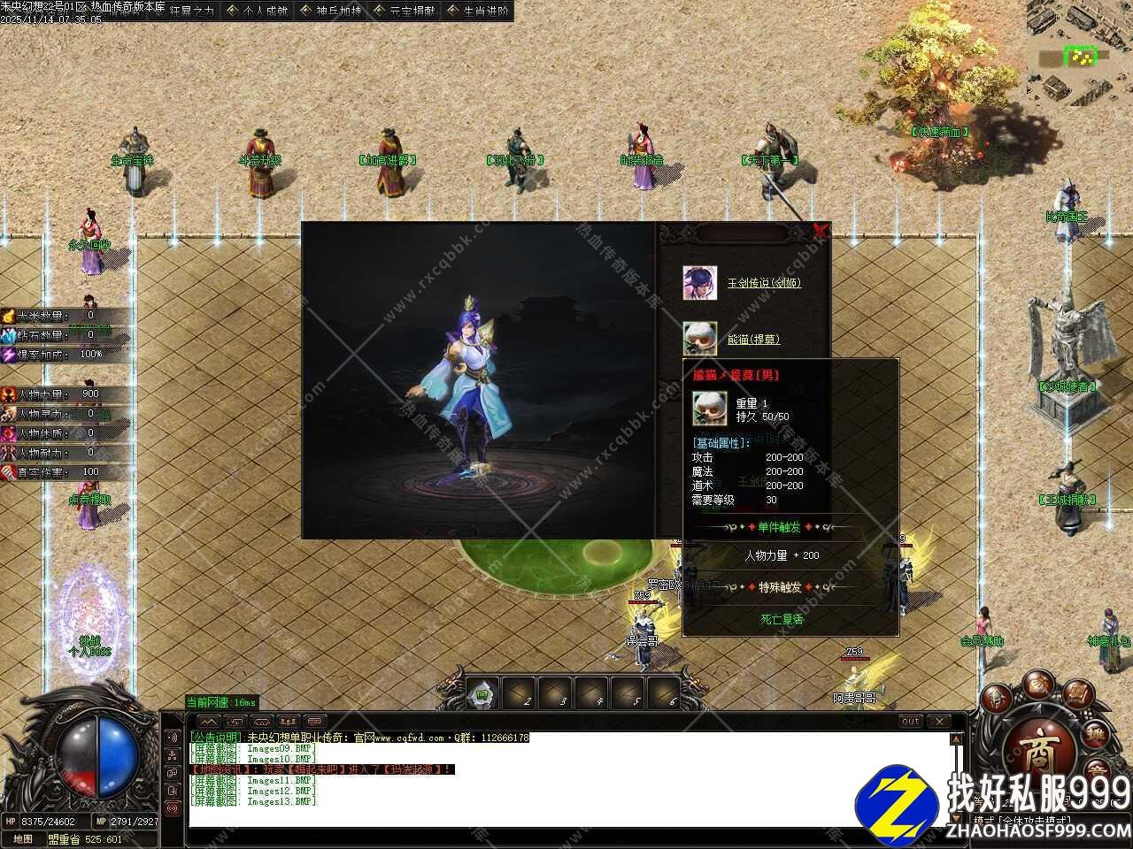 五.添加装备强化功能,重新强化极品攻、魔、道,元素不变,强化后攻击随机0-20点,魔道随机0-10点,能洗出最高攻击,每次强化需要10万元宝 ,强化时把需要洗练的装备放入对话框中即可。