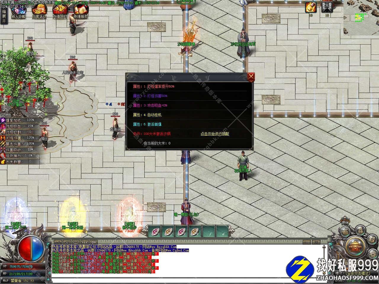 版本介绍:沙城捐献可提升怪物爆率,爆率+50%、打怪伤害+20%、人物攻击吸HP+2%,自动挂机......