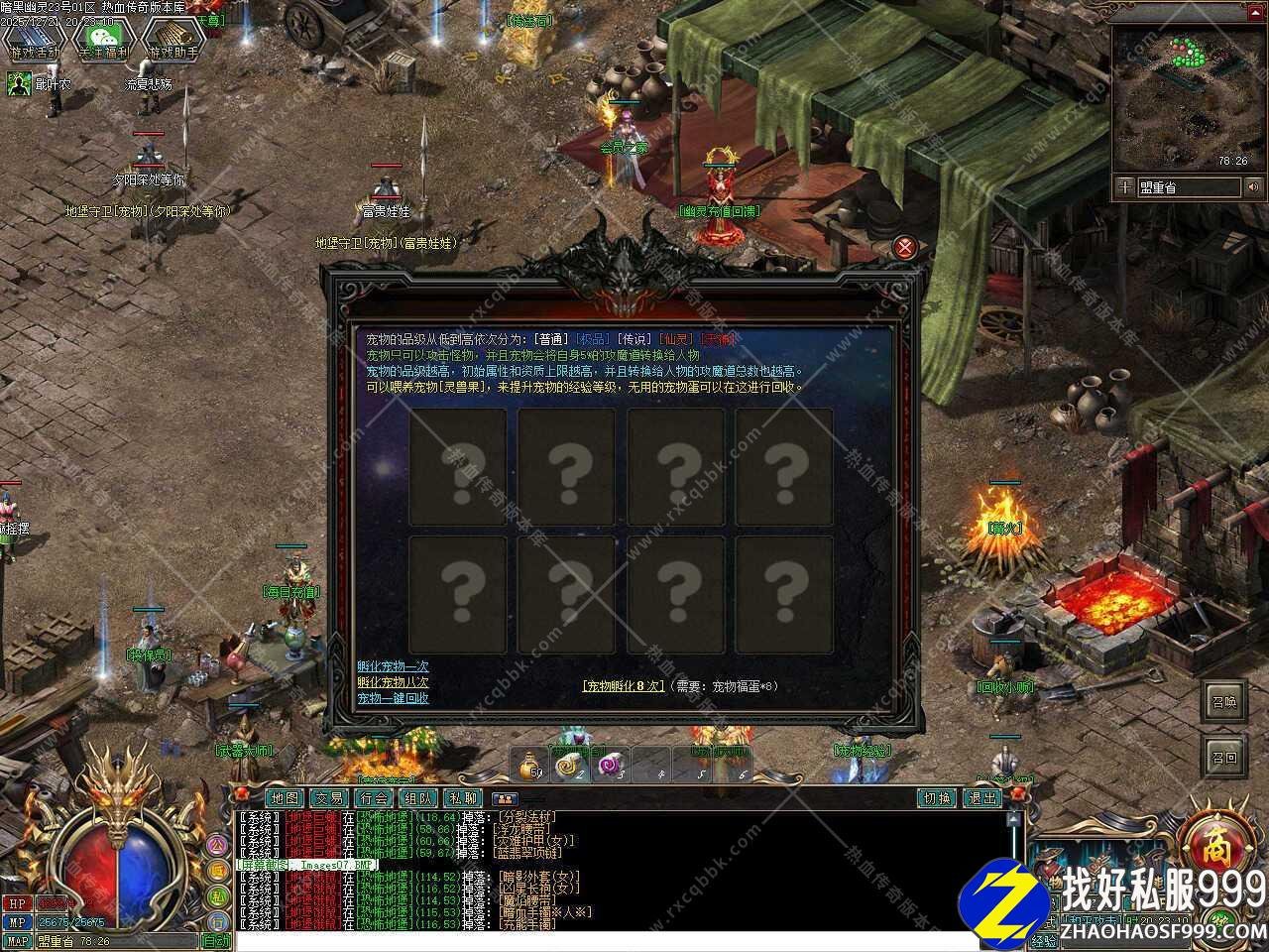 四.添加宠物大师NPC,宠物的品级从低到高依次分为普通、极品、传说、仙灵、天神,宠物只可以攻击怪物,并且宠物会将自身5%的攻魔道转换给人物,宠物的品级越高,初始属性和资质上限越高,并且转换给人物的攻魔道总数也越高。可以喂养宠物灵兽果,来提升宠物的经验等级,无用的宠物蛋也可以进行回收。